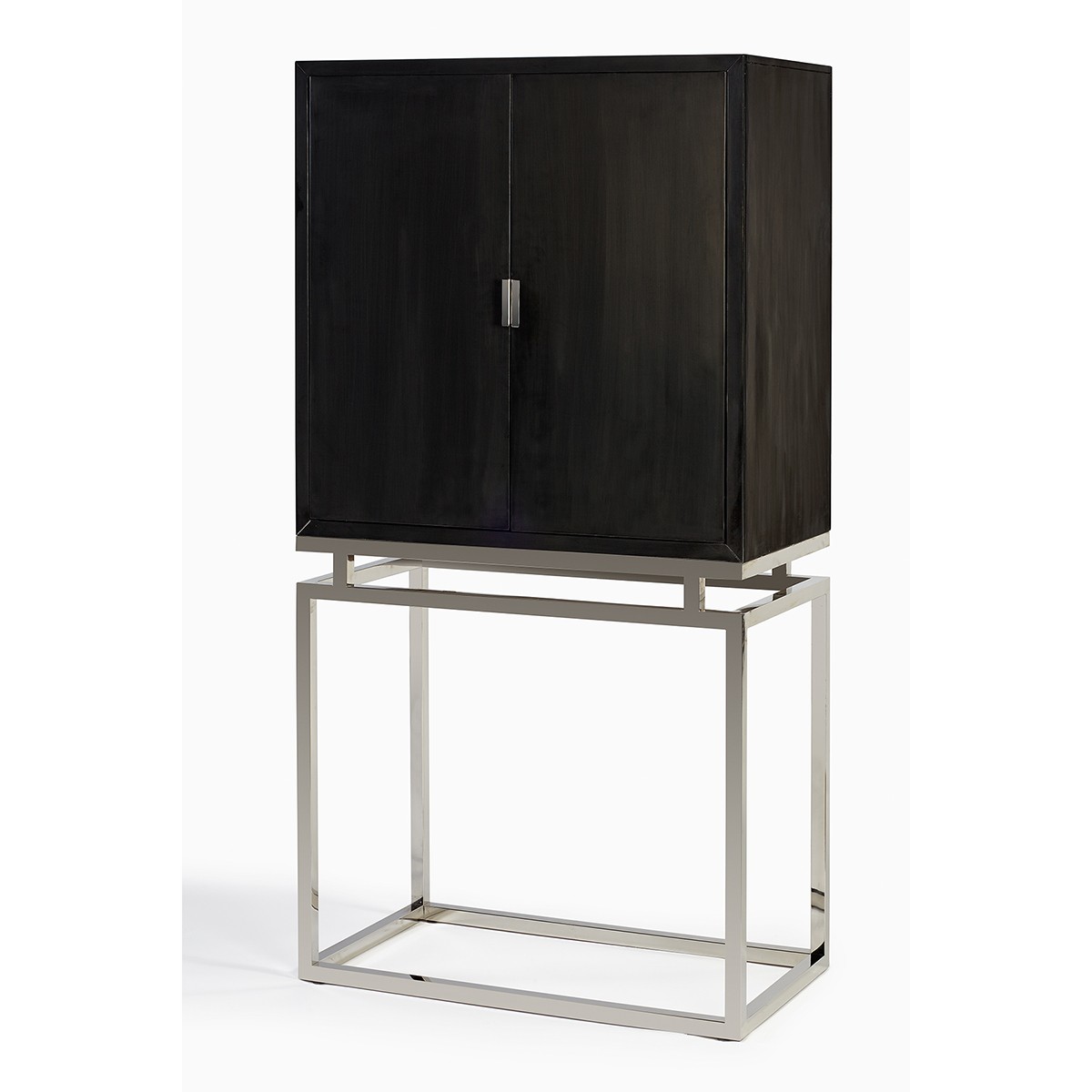 Os presentamos este armario de madera de color negro con base y tiradores de acero. Este armario se compone en su interior de una trasera de espejo y de dos baldas de Cristal. Armario diferente y súper original. Puedes poner los objetos decorativos que más desees. Líneas rectas y depuradas, creando armonía y elegancia.
