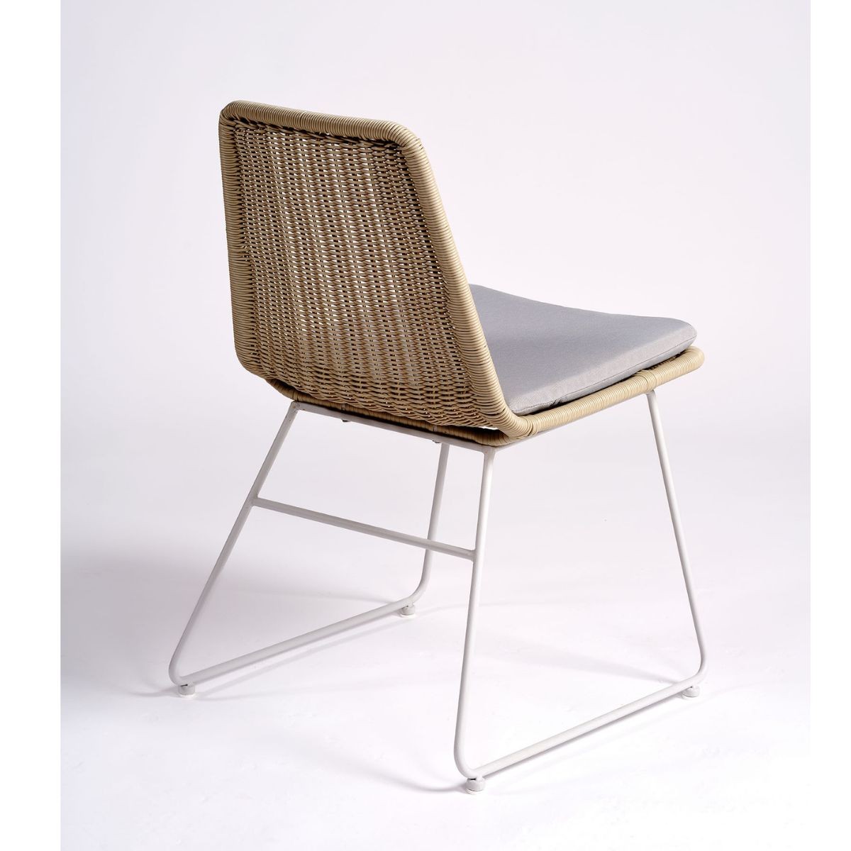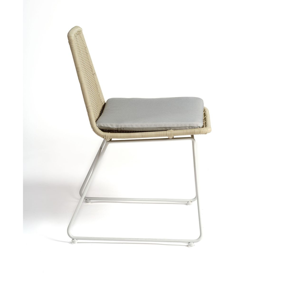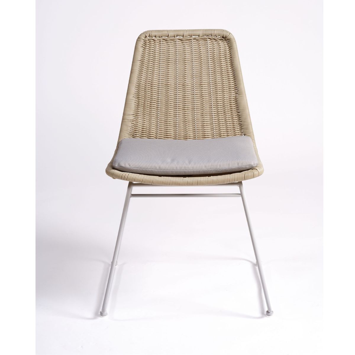 Silla de ratán sintético color tiza. Estructura de las patas de metal en color blanco piedra. Silla apta para exterior ya sea a la intemperie, jardín o porche. Cuenta con un cojín en tonos similares para aportar mayor comodidad. También disponible en modelo sillón con brazos en altura de comedor.