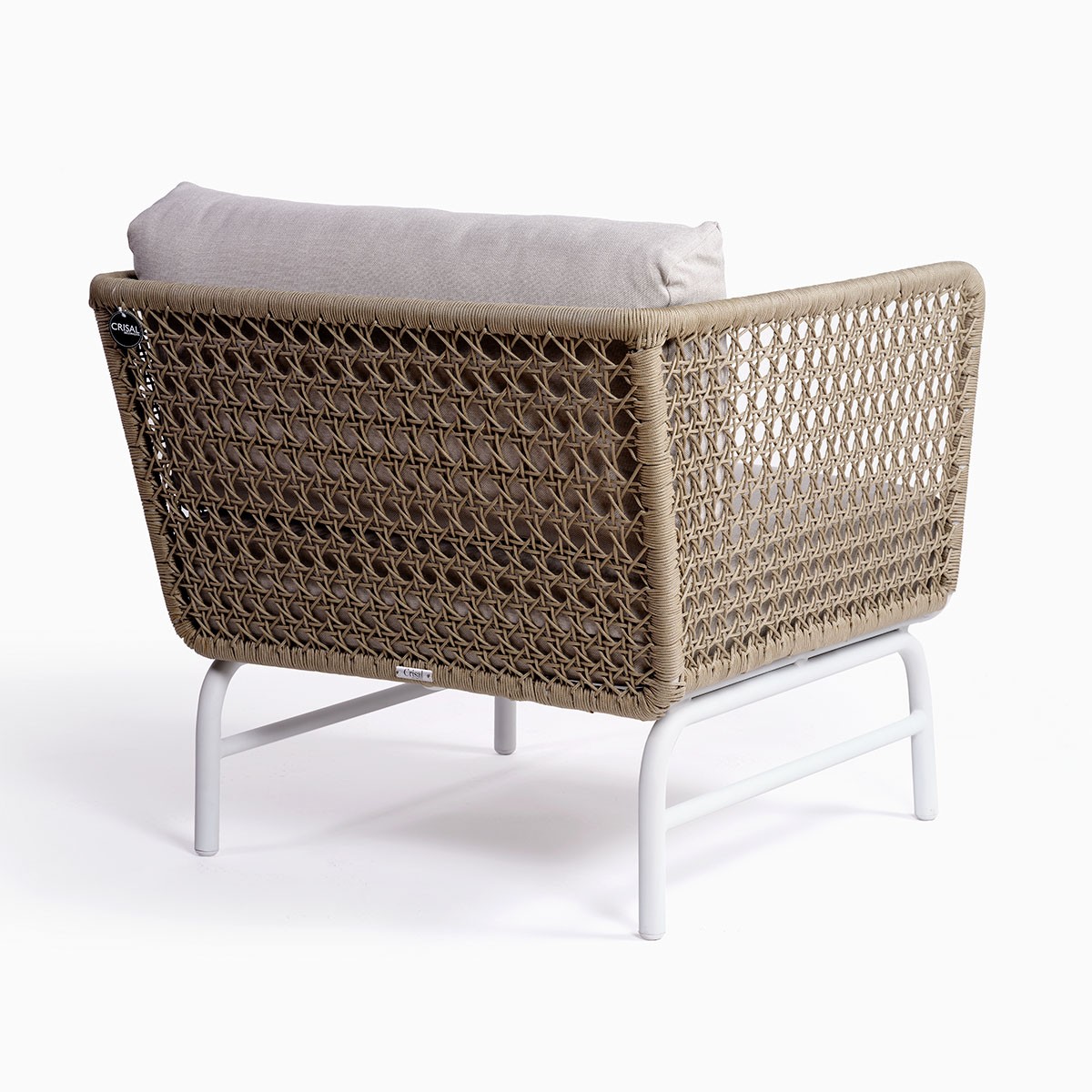Sillón de exterior de cuerda sintética color topo con cojines tapizados color gris lino. Combínalo con el sofá ROLAND-1 para crear un conjunto de exterior. Una pieza, moderna, ligera y cómoda. Dimensiones: 89x84,5x77