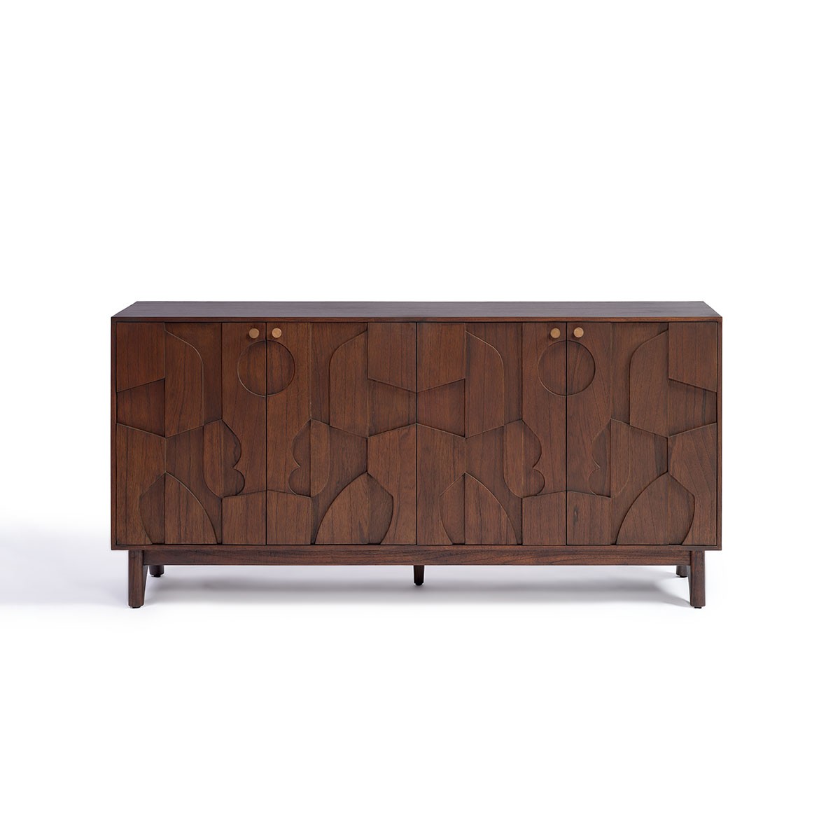 Brown wooden sideboard with four doors. The door fronts feature geometric reliefs that give the piece a unique look. The interior is divided by a central shelf that bisects the sideboard's height. The sideboard's structure is supported by a distinctive leg made of the same wood with curved lines. Dimensions: 162 x 43 x 78 cm