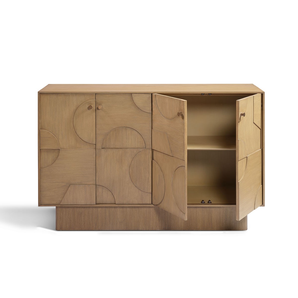 Natural wood sideboard with four doors featuring geometric reliefs and metal handles. The sideboard's structure is supported by a solid wood block base. A modern-contemporary sideboard with plenty of character.