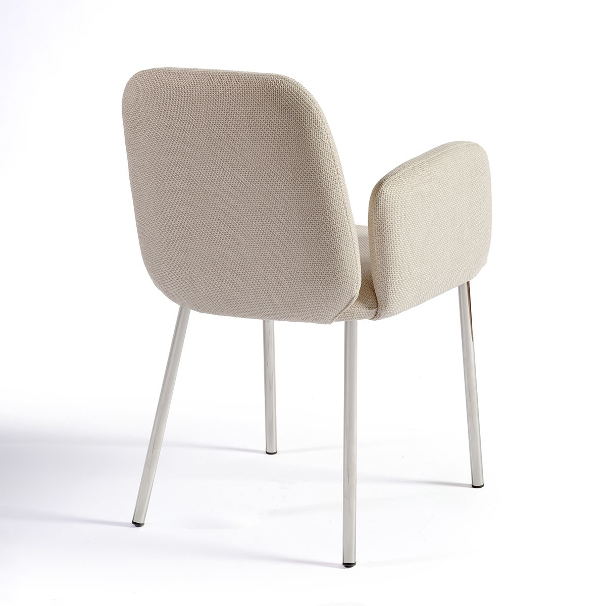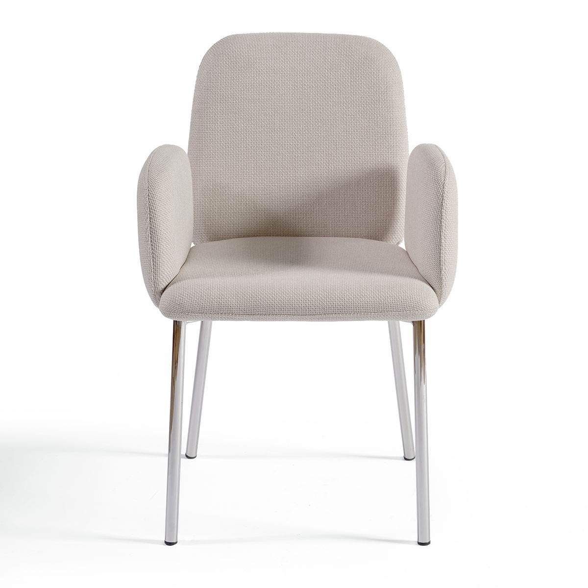 Armchair upholstered in stone gray with chromed steel legs. Dining chair with a modern touch.