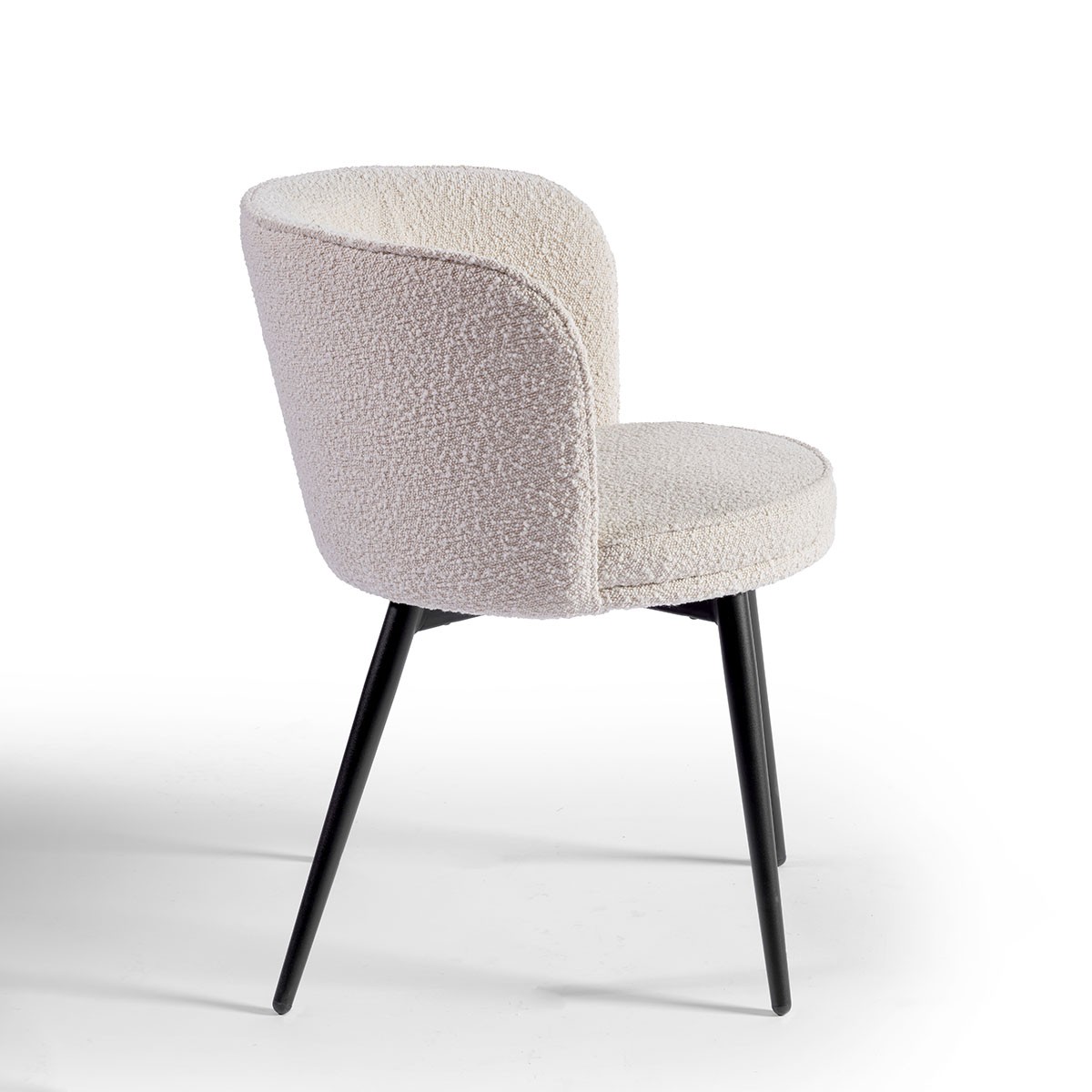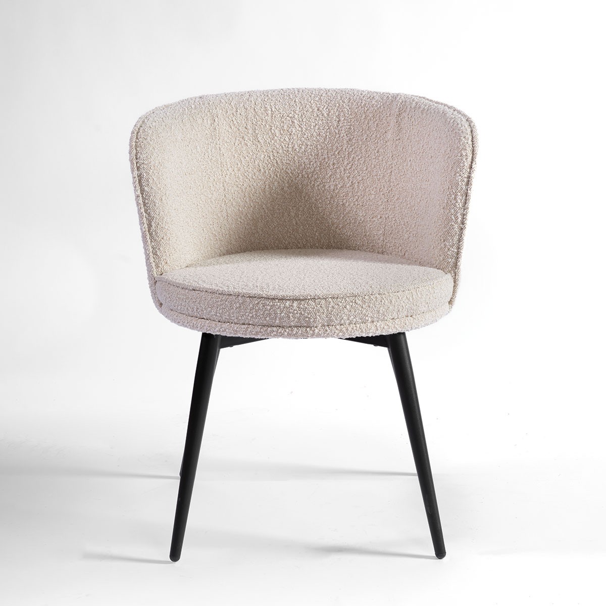 Upholstered chair with a rounded backrest in a sand color and black metal legs. A chair with curved lines and a touch of retro style.
